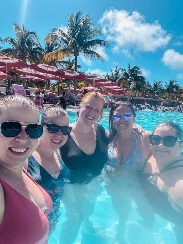 The adventures didn’t stop when we were at sea either. Besides our two relaxing sea days, we also had stops in Puerto Plata in the Dominican Republic and The Beach Club at Bimini, which is Virgin Voyages’ private party island. In Puerto Plata, we did the Waterfalls of Damajagua excursion, and honestly, it was a highlight of the entire trip! Trekking through the beautiful Dominican countryside and then actually going down these amazing waterfalls – either by plunging in or carefully sliding – was just exhilarating. The water was so cool and refreshing, and the natural beauty of the canyons was breathtaking. Then came the pure bliss of The Beach Club at Bimini. Stepping onto that perfect white sand with the crystal-clear Bahamian water was like stepping into a dream. We spent the whole day just lounging in style, soaking up the sun, sipping on delicious drinks, and dancing to some incredible DJ sets. The energy was vibrant but still so relaxed – the perfect way to unwind and keep the birthday celebrations going. A good tip for the Beach Club is to be on the first tram which was around 8AM. We had our pick of pool chairs and by 10AM the whole place was packed. There were more than enough beach chairs to go around but my group wanted to be closer to the pool area.